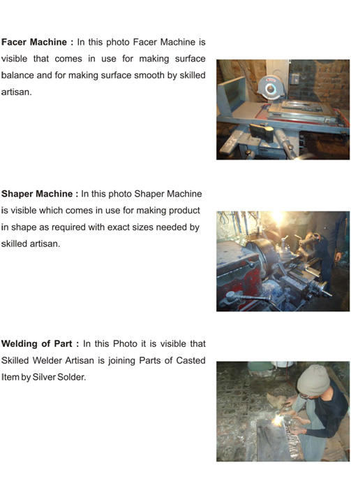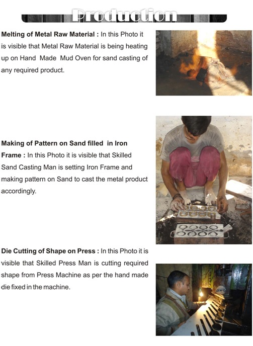 We have in-house facilities of production like Sand Casting furnace, Grinding machines, Polishing machines, Finishing facilities, Sample room, Packing Halls, Factory showroom etc.